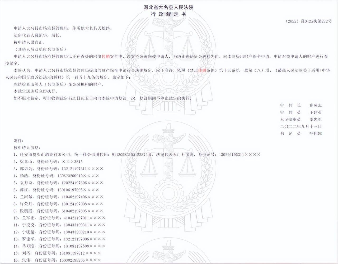 据中国裁判文书网2022年9月13日一则河北省大名县人民法院发布的《大名县市场监督管理局、大名县市场监督管理局以正在查处的网络传销案件中等行政监察(监察)财产保全执行执行裁定书》显示: