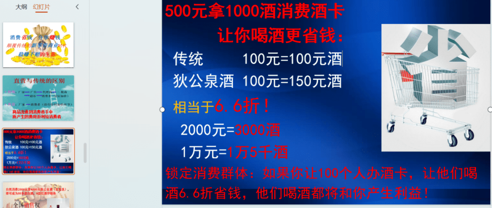 贯头山酒业对外宣称,只要消费500元,就可以拿到1000元酒的消费酒卡,相当于6.6折,也就是100元=150元酒,2000元=3000元的酒,1万元=15000元的酒,如果你让100人办酒卡,让他们喝酒6.6折,不仅省钱,他们喝的酒都将和你产生利益。