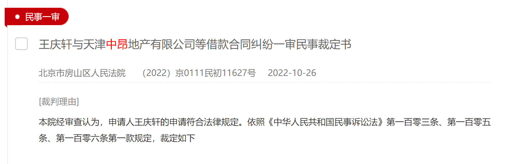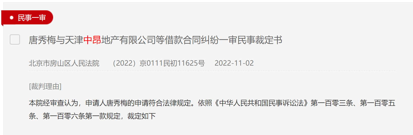 2023年6月6日,北京市门头沟区人民法院发布的执行裁定书显示,自然人张某与中昂地产等公司合同纠纷已经判定,张某于2023年2月22日申请强制执行,要求中昂地产、北京晟雅商业、重庆尚清等给付11.5435万元及利息、执行费。