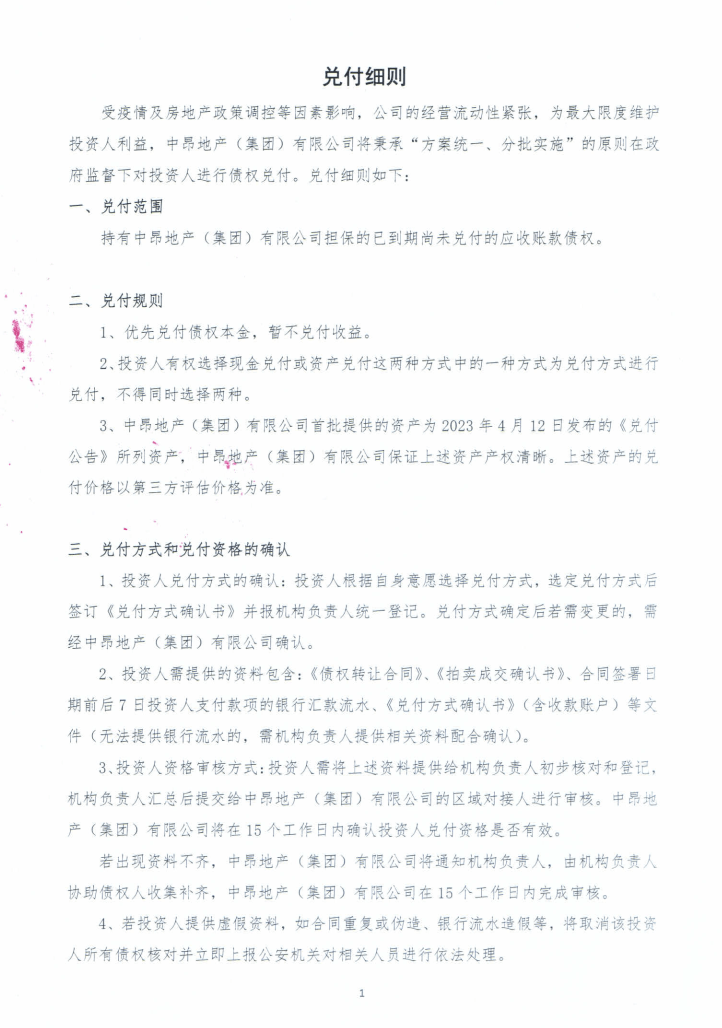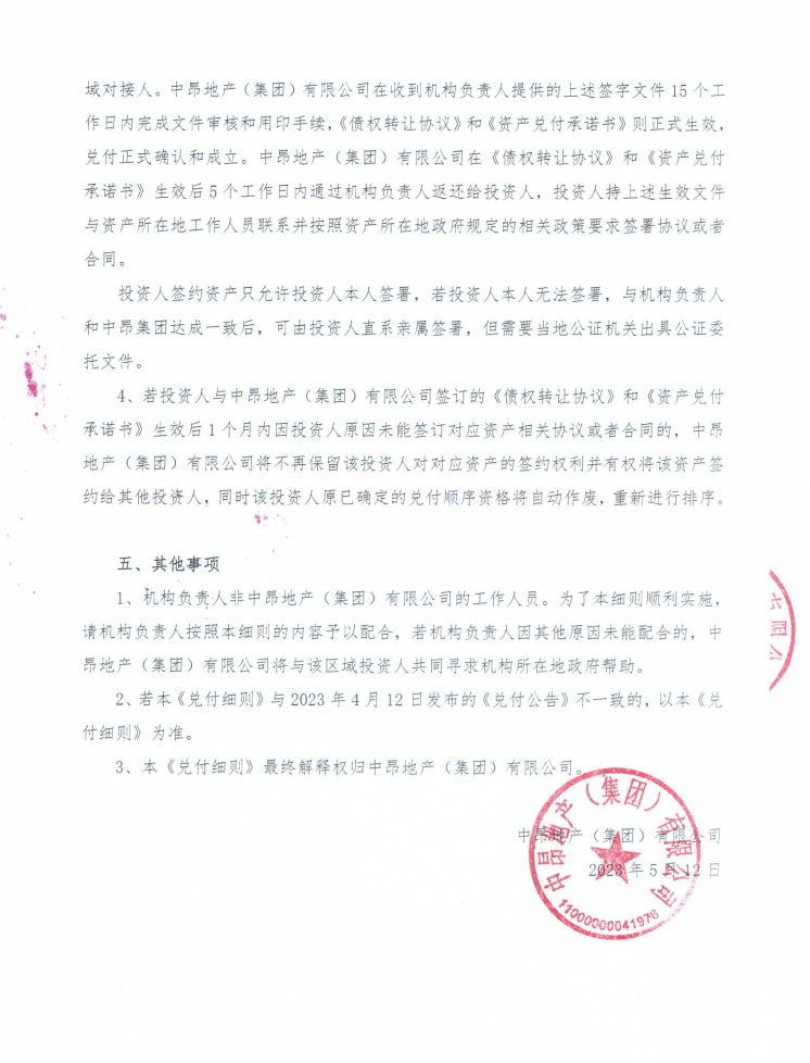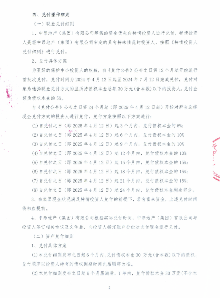 以地产起家的中昂系,在房地产行业调整期亦面临经营困境。时代周报记者获得的一份2023年5月中昂地产(集团)有限公司盖章兑付文件显示,中昂地产集团称因为房地产政策等原因流动性紧张,需要对债权延迟兑付,2024年4月开始兑付30万债权以下的5%本金,2025年4月开始对所有债权本金进行兑付,兑付额度也是5%,按照其兑付方案,要到2027年才能将债权本金兑付完成。