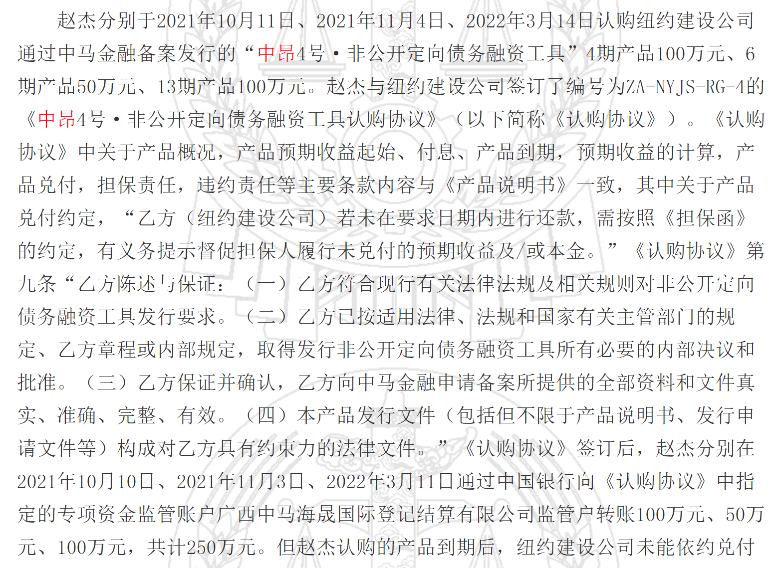 购买中昂系债权路径基本类似,除了汇铨佳得拍卖平台外,还有投资人通过广西中马新城国际金融服务中心,购买中昂系公司纽约建设公司所发行的“中昂4号·非公开定向债务融资工具产品”等。