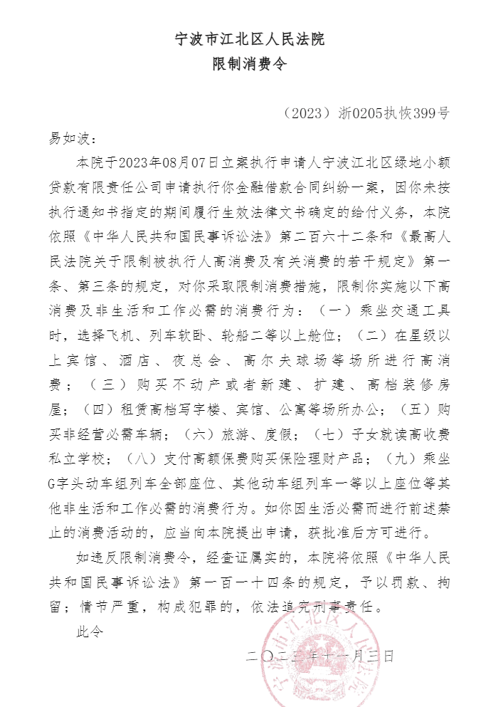 目前,易如波多次成为被执行人且被发送限制消费令。