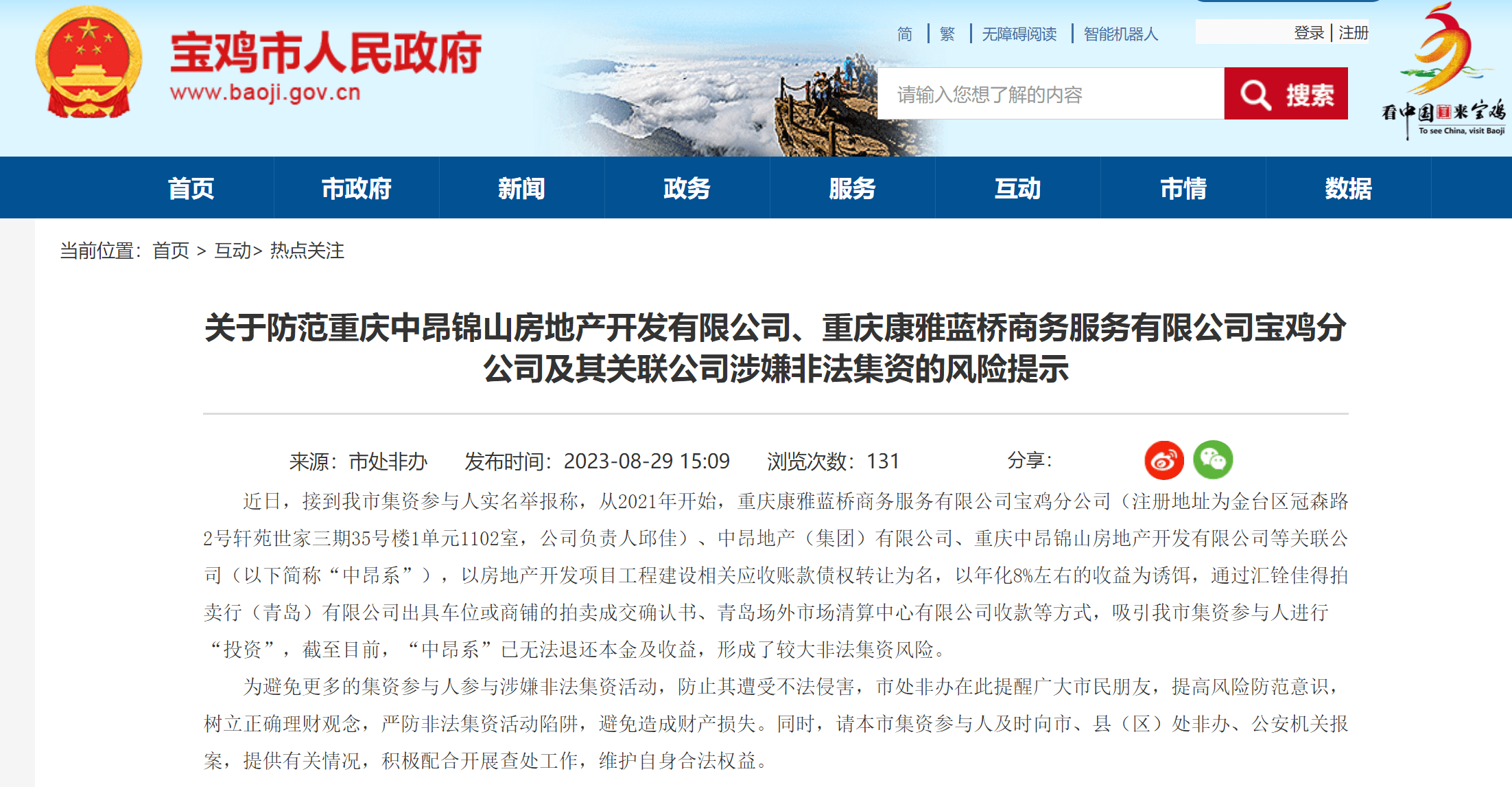8月29日,宝鸡市人民政府处非办发布《关于防范重庆中昂锦山房地产开发有限公司、重庆康雅蓝桥商务服务有限公司宝鸡分公司及其关联公司涉嫌非法集资的风险提示》(下称“《风险提示》”)。宝鸡市政府处非办称,截至目前,中昂系已无法退还本金及收益,形成了较大非法集资风险。