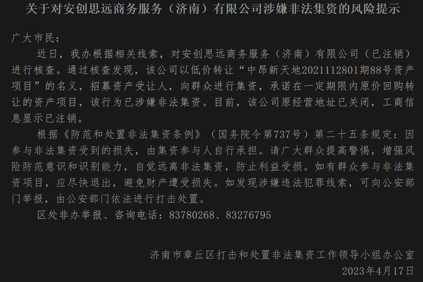 除了陕西宝鸡外,济南市章丘区打击和处置非法集资工作领导小组办公室也在4月17日发布警示,安创思远商务服务(济南)有限公司(已注销)以低价转让“中昂新天地2021112801期88号资产项目”的名义,招募资产受让人,向投资人进行集资,承诺在一定期限内原价回购转让的资产项目,该行为已涉嫌非法集资。目前,该公司原经营地址已关闭,工商信息显示已注销。