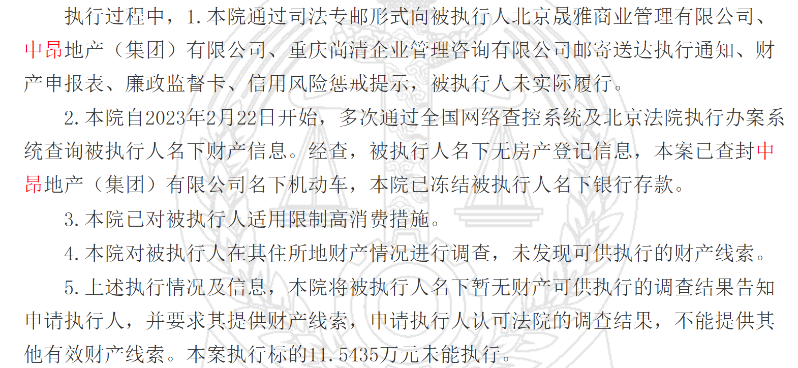 门头沟区人民法院在执行裁定书中称,执行过程中,通过司法专邮形式向被执行人北京晟雅商业管理有限公司、中昂地产(集团)有限公司、重庆尚清企业管理咨询有限公司邮寄送达执行通知、财产申报表、廉政监督卡、信用风险惩戒提示,被执行人未实际履行。