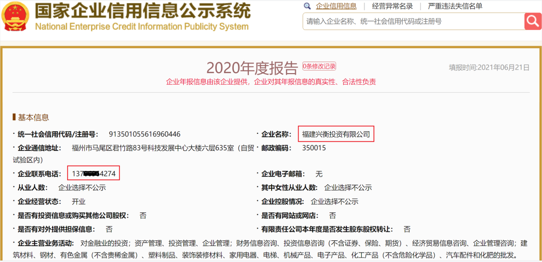 开甲财经注意到,兴衡投资2020年企业年报披露的的企业联系电话为137XXXX4274,这与福建阳光物流有限公司(简称“阳光物流”)2020年企业年报披露的企业联系电话137XXXX4274一致。