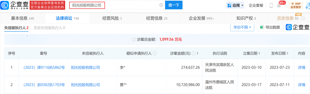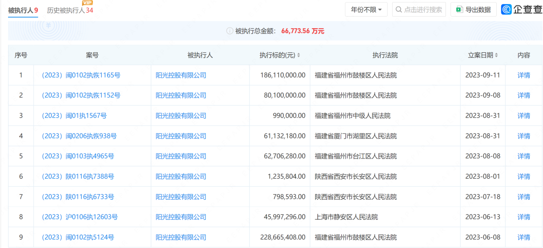 企查查数据显示,阳光控股共有2条失信被执行人记录,涉案总额1099.56万元。另外,阳光控股还有9条被执行记录,被执行总额6.68亿元。
