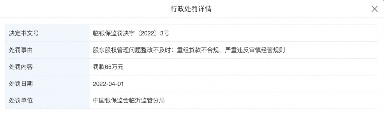 记者梳理发现,股东关联贷款,亦是另一个突出的股东问题。根据临商银行2022年年报,关联股东贷款共计297322万元人民币。2022年4月,临商银行因为股东股权管理问题整改不及时;重组贷款不合规、严重违法审慎经营原则遭行政处罚。