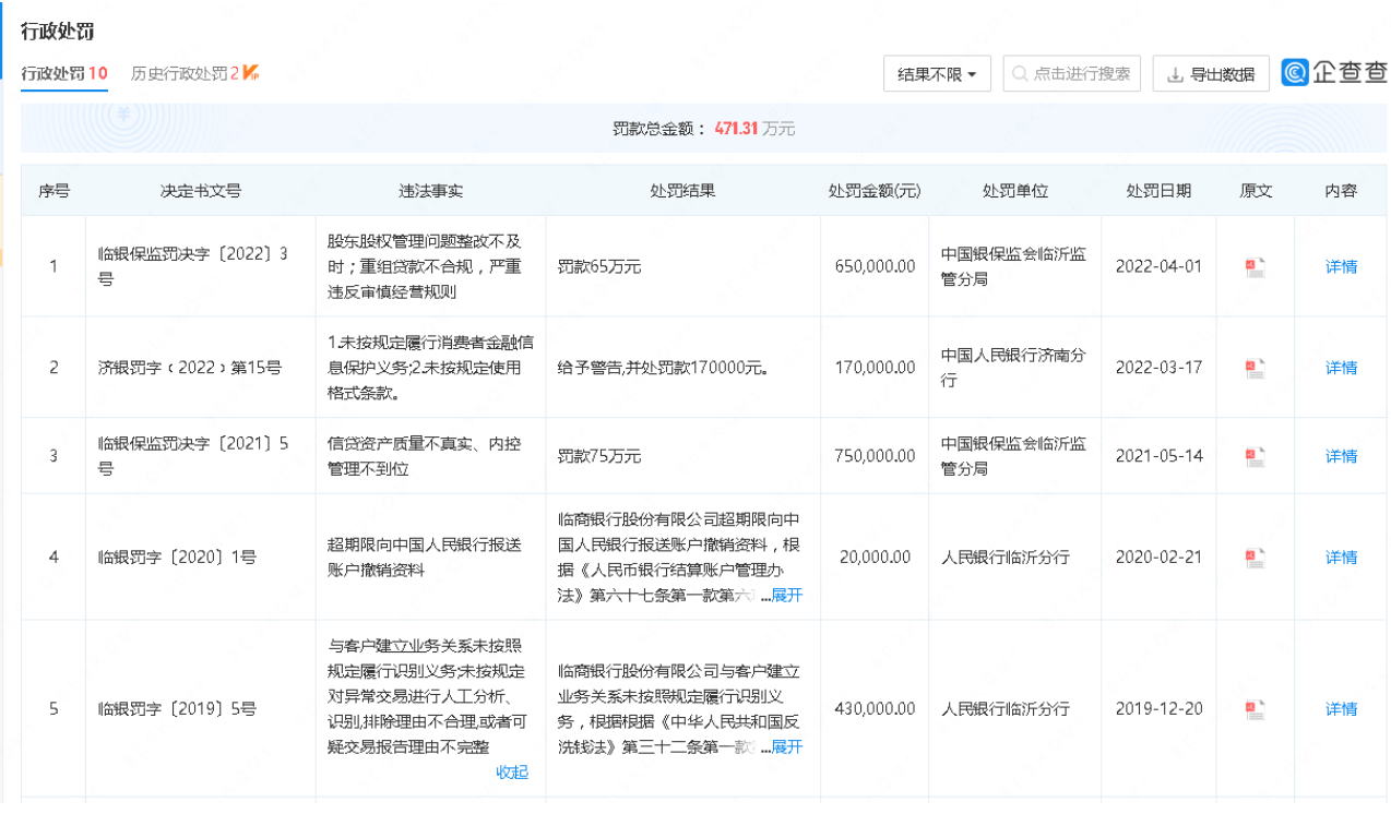 然而,根据天眼查数据显示,在2022年年报中临商银行的前十大现有股东中,有持有11.54%的华和信投资有限公司2021年4月别列为强制执行人;持有3.75%股份的日照钢铁控股集团有限公司因未按时履行法律义务被法院强制执行多达11次;持有3.48%股份的山东金升有色集团有限公司因存在信用问题被7次限制高消费,2023年4月24日山东金升有色集团有限公司被法院强制执行;巧合的是,第二天4月25日临商银行被法院强制执行;而持有2.8%股份的临沂矿业集团有限责任公司不但被法院强制执行,还因安全问题接到行政处罚。