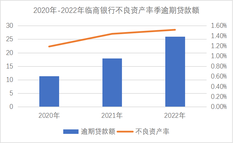 然而,根据临商银行2022年年报显示,2022年末,临商银行的逾期贷款(含垫款)为26.05亿元,较上年末增长45.45%;不良资产率为1.52%,较上年末上升8个基点。在2020年至2022年,临商银行的逾期贷款分别为11.43亿元、17.91亿元、26.05亿元;不良资产率分别为1.19%、1.44%、1.52%。可以看出,临商银行的逾期贷款和不良资产率均已连续两年出现上升趋势。