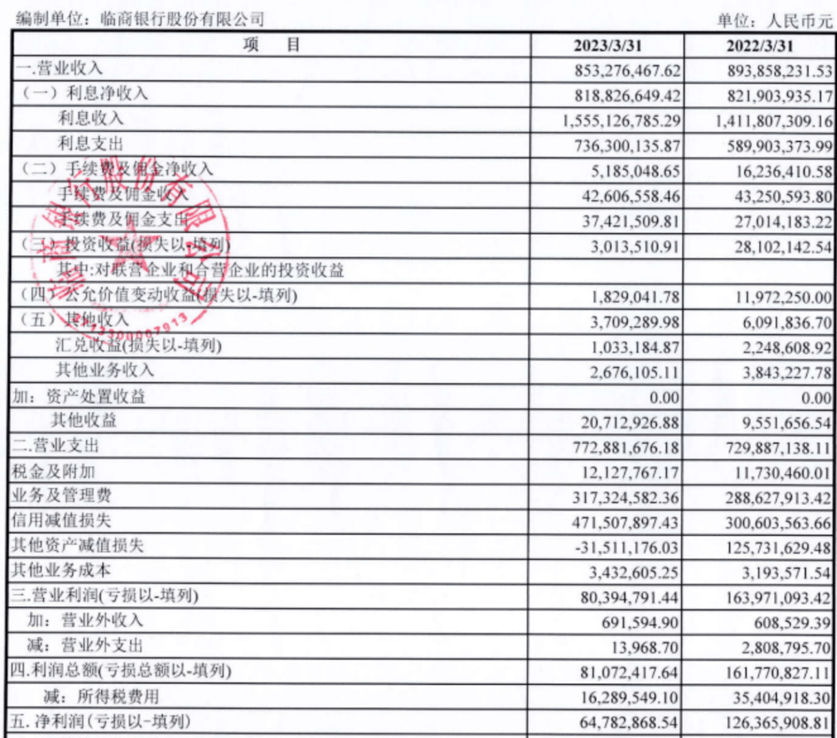 2023年以来,从各家银行陆续披露的一季报数据来看,银行业绩承压的现象并不鲜见。不过,较上年同期相比,临商银行本就不多的净利润竟然腰斩。根据临商银行公布的一季报显示,一季度的利息净收入为8.19亿元,同比微降0.4%;手续费及佣金净收入为518.5万元,同比上年的1623.6万元下降68%;投资收益为301万元,同比下滑89%。另外,公允价值变动收益和其他收入分别同比下滑85%和39%。