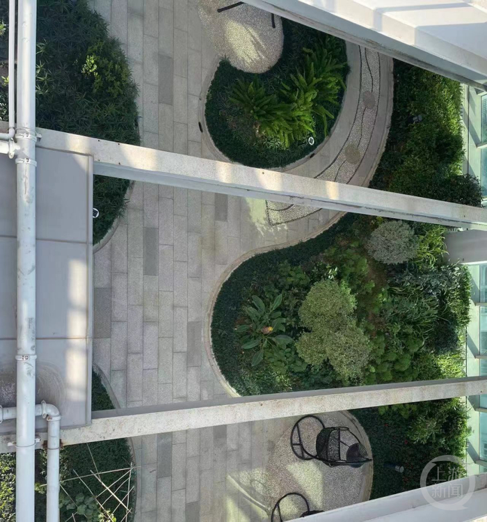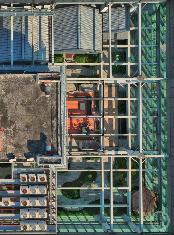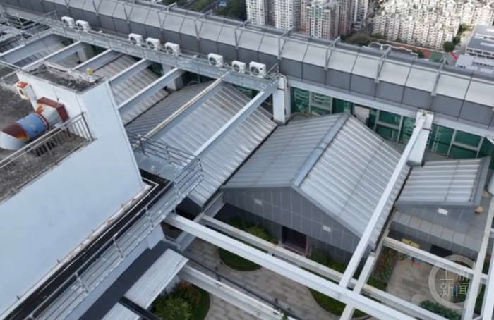 那么被上锁的天台是什么样?上游新闻记者航拍发现,天台四角有多处隐蔽房屋建筑,通体颜色较浅,门窗紧闭。房屋前铺有红色门垫,房屋外有绿植环绕,并设有凉亭座位。