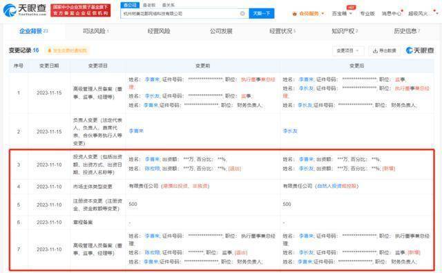 根据天眼查App信息,涉事公司杭州树美花郡网络科技有限公司成立于2022年2月,法定代表人为李长友,注册资本500万元人民币,经营范围包括文化娱乐经纪人服务、组织文化艺术交流活动、互联网直播技术服务、市场营销策划等,由李喜来、李长友共同持股。