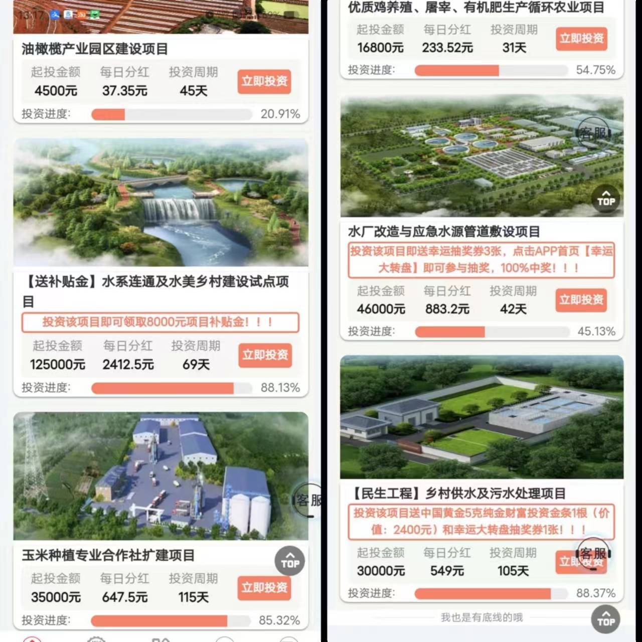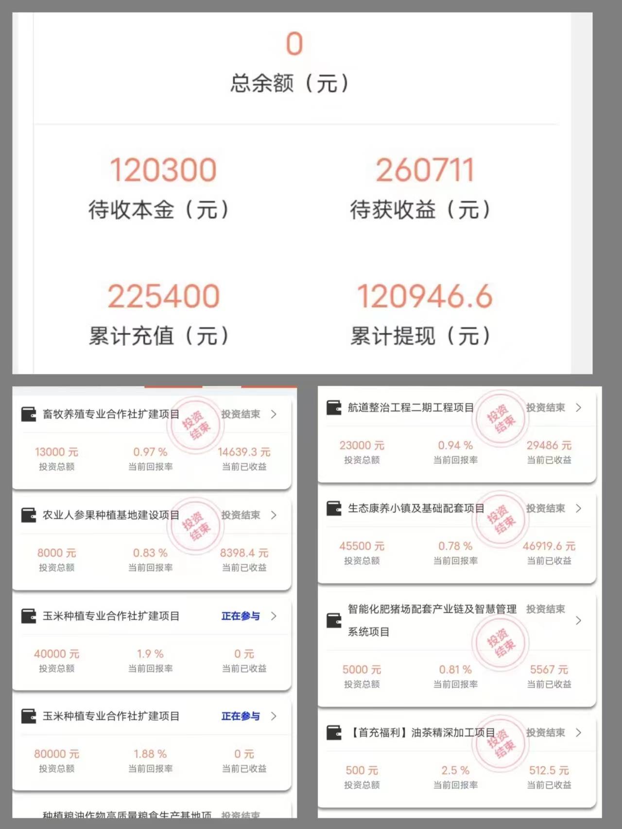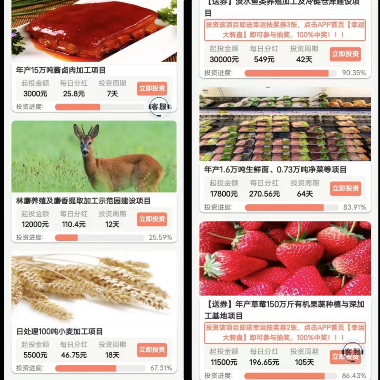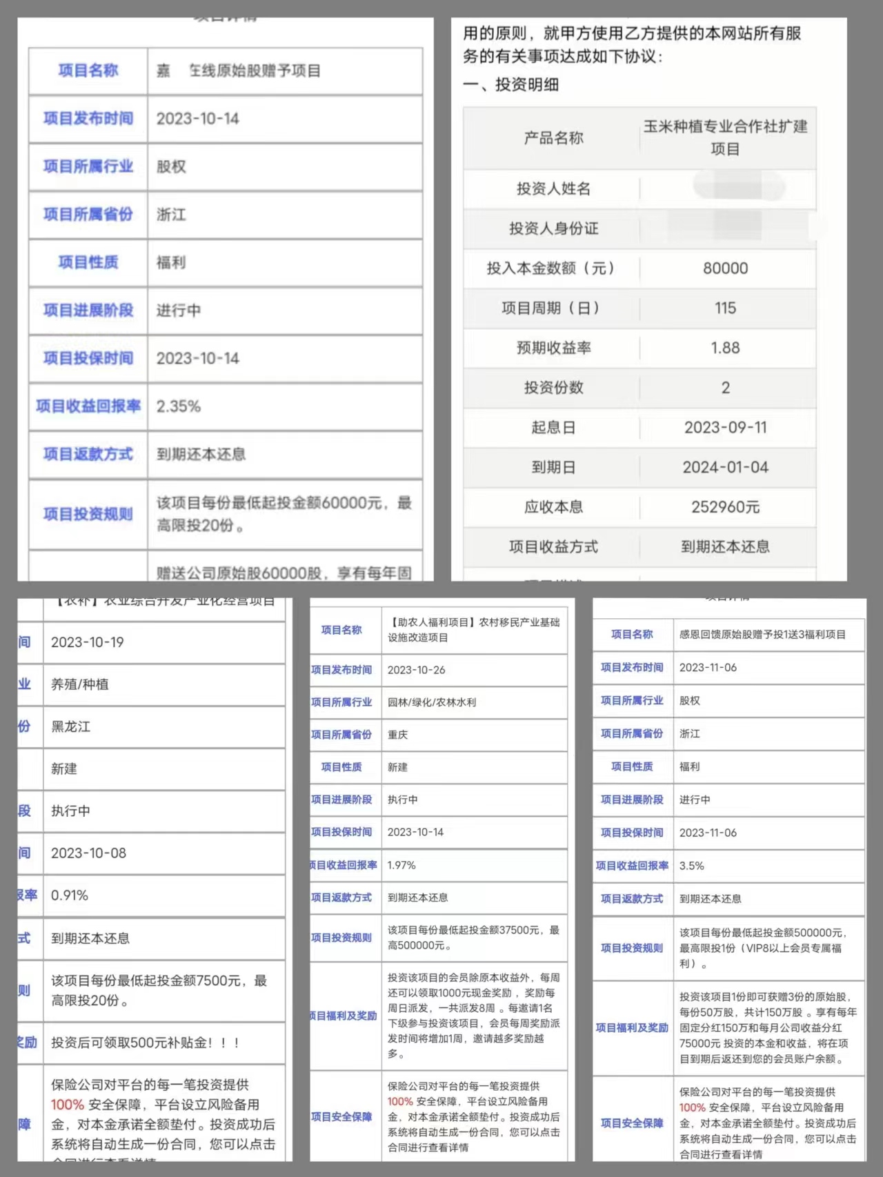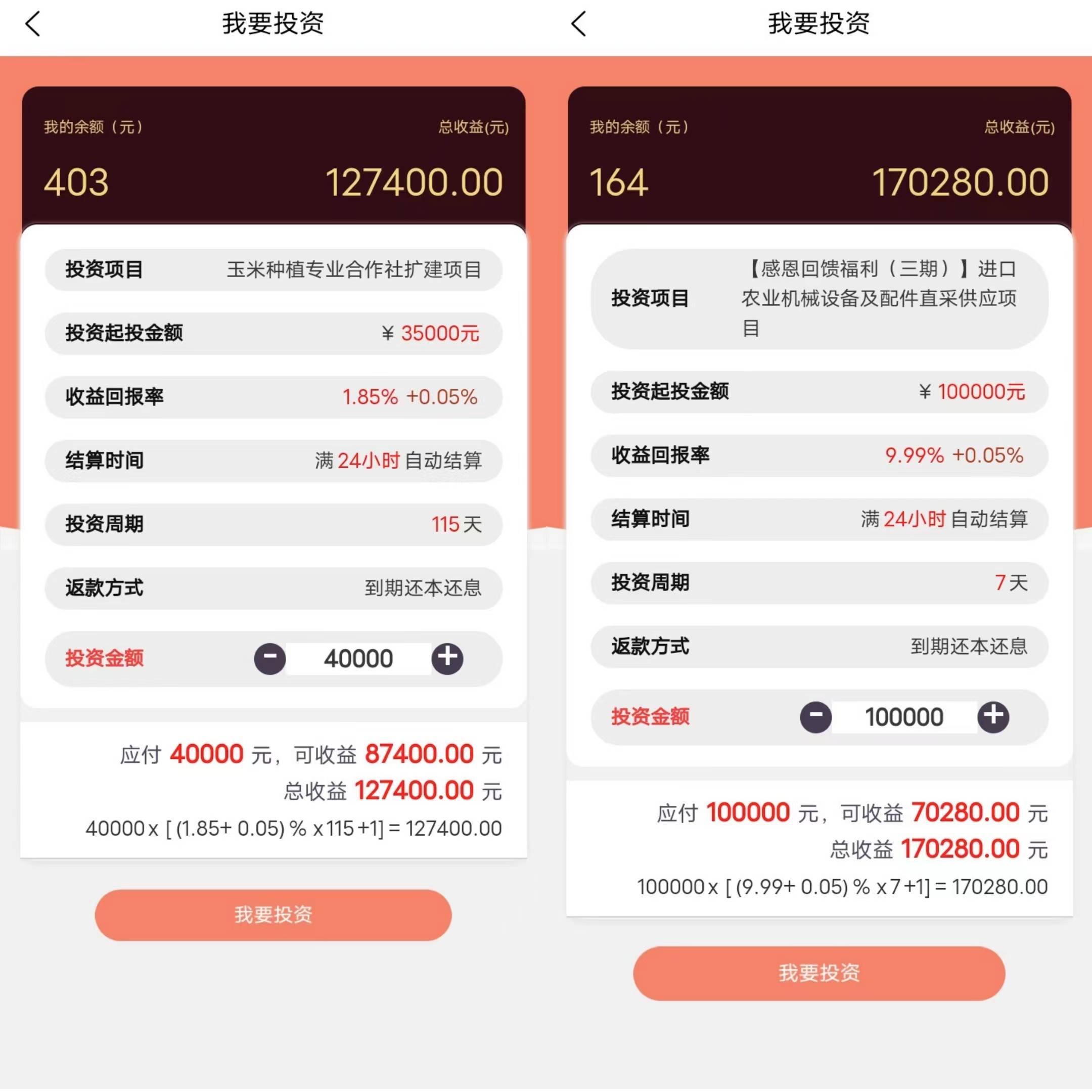这些投资项目的收益率非常高,以“玉米种植专业合作社扩建项目”为例,该项目起投金额35000元,投资周期115天,每日分红647.5元,日收益率高达1.85%,最高可达3%,远远高出银行的存款利息。