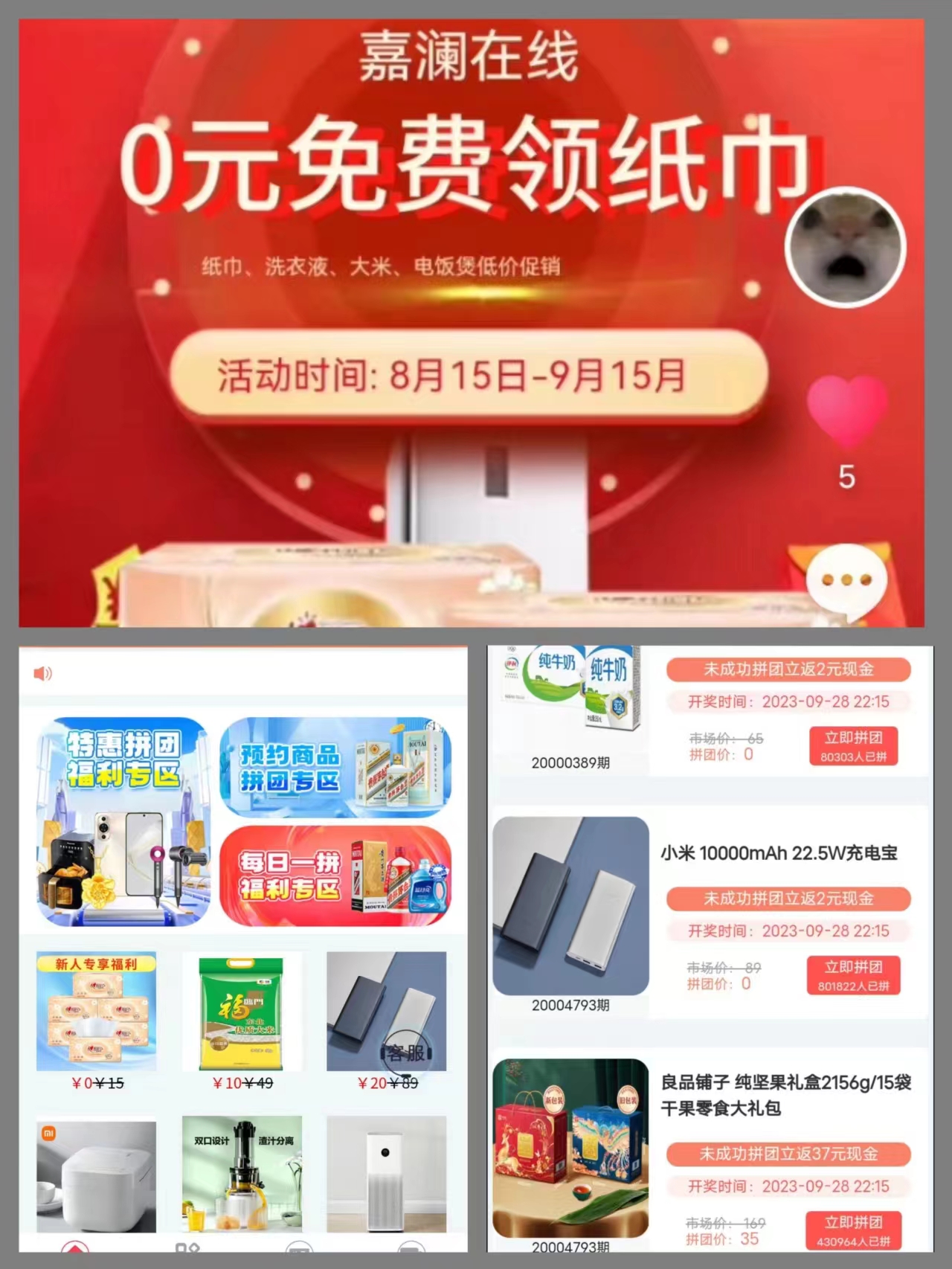 郝女士偶然在社交短视频平台上点开了“低价拼团”的广告链接,下载了一个名为“嘉澜在线”的app,在该app的内部页面显示着各种低价拼团的购物信息,0元的牛奶、700元的手机、500元的黄金吊坠……只要参与就有机会,拼团未成功也会以比拼团价更高的现金额进行返还,即使不参与拼团,每天点击签到,就可领取2元现金。