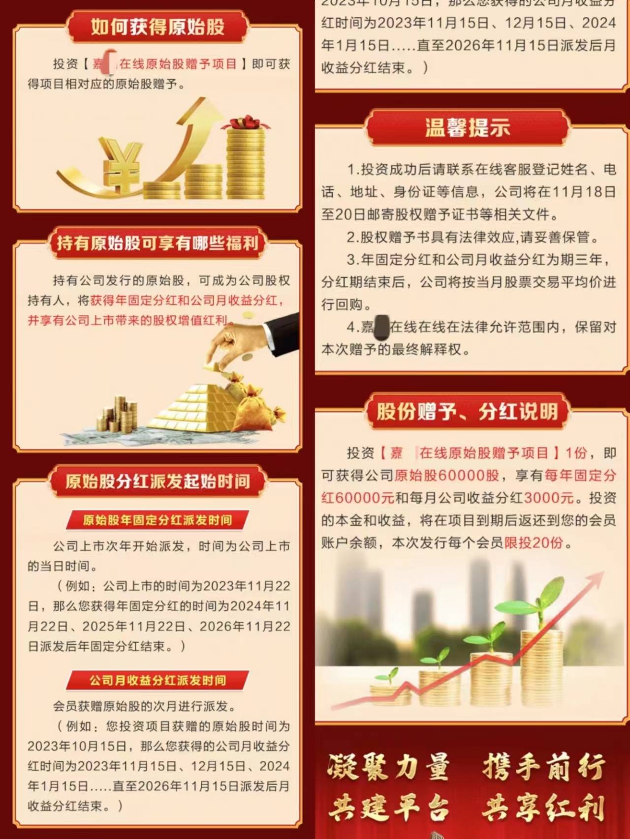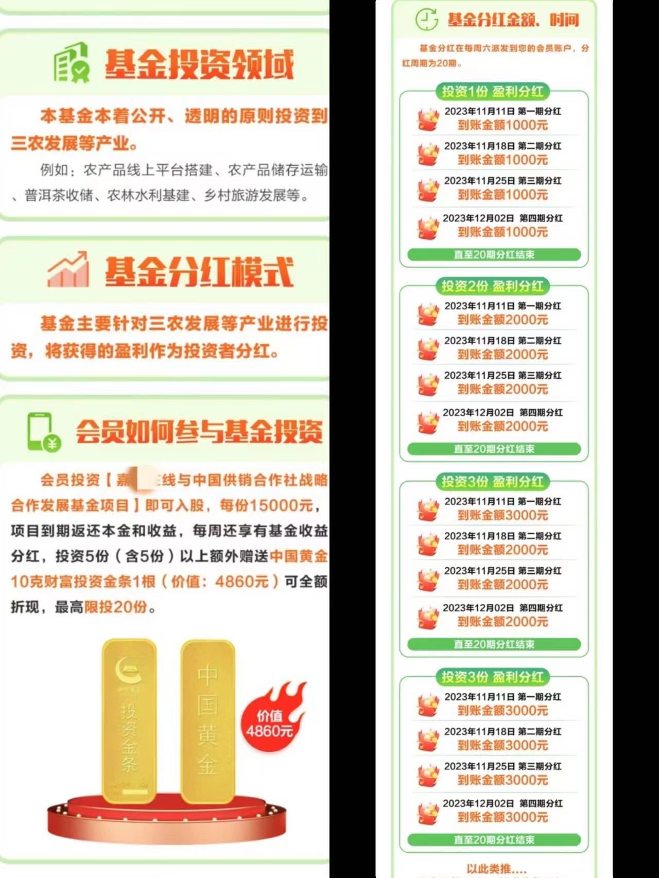 郝女士告诉李旭反传防骗团队,除了这些简单的投资项目,“嘉澜在线”平台经常推出一些十分诱人的合作类项目,邀请会员入股。例如:2023年十月,“嘉澜在线”推出“嘉澜在线与供销合作社战略合作发展基金项目”,该项目每份15000元,但是除了可以收获本金收益外,每周还享有基金分红,购买5份还可额外赠送10克黄金,黄金可以全额折现。