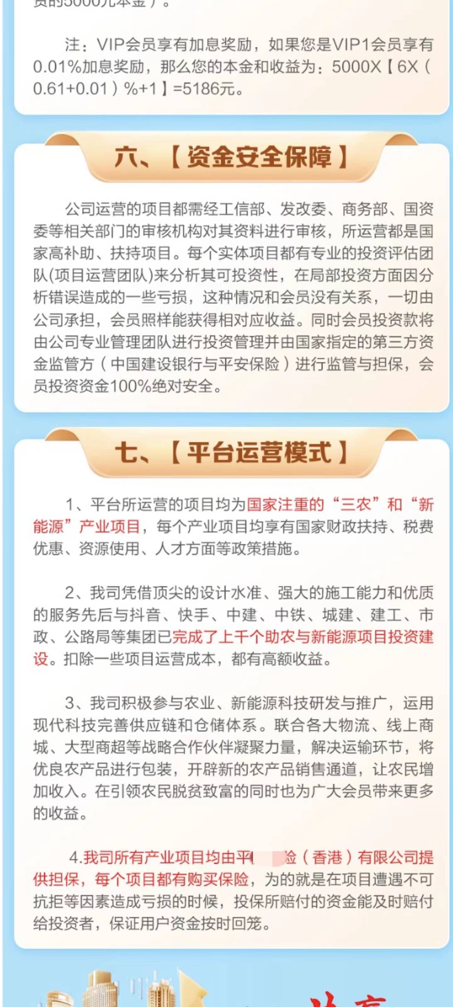 郝女士表示,平台一直宣称这些项目都是国家高额补助、扶持的项目,且全部经由国家相关部门审核通过,并由第三方资金监管方进行监管与担保,投资资金绝对安全。甚至平台还为每个项目购买了保险,如出现亏本,由保险公司对投资者资金进行赔付,可以说是稳赚不赔。