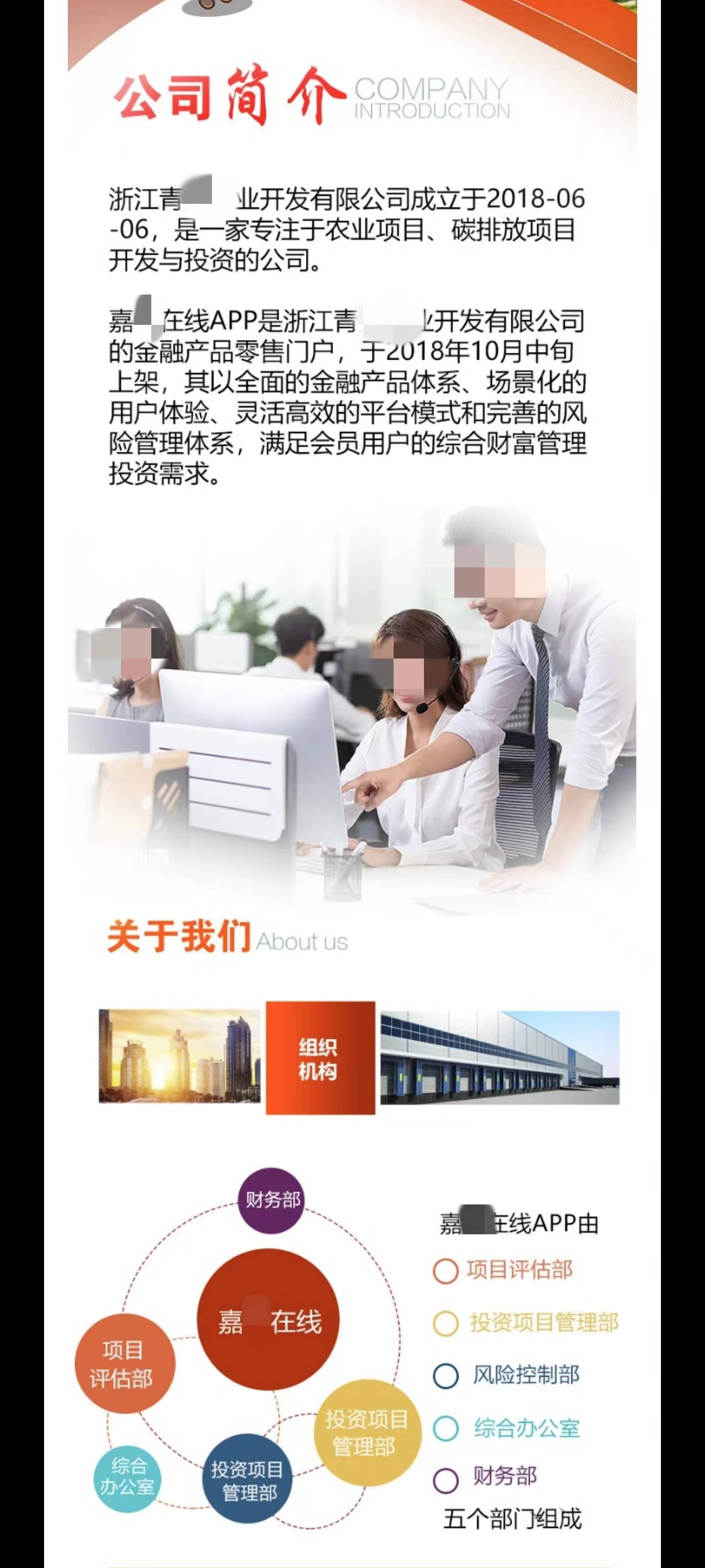 郝女士注册了一个账号想要试一试,可是,当郝女士登录注册好的账号后,app内部的页面信息竟然自动跳转到“嘉澜在线”项目投资界面。根据“嘉澜在线”app上的介绍显示,该app隶属于浙江青某农业开发有限公司,是在政府助农补贴下组建的助农、新能源项目投资平台。