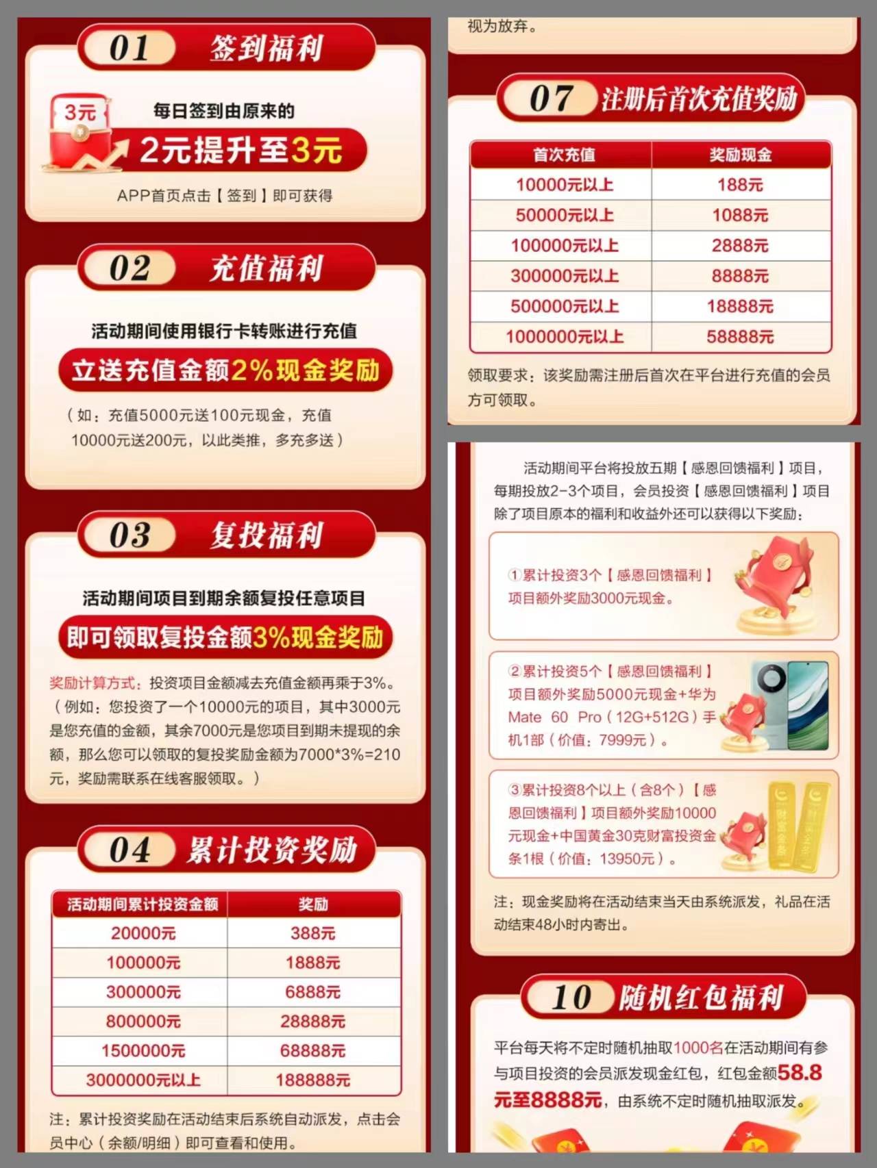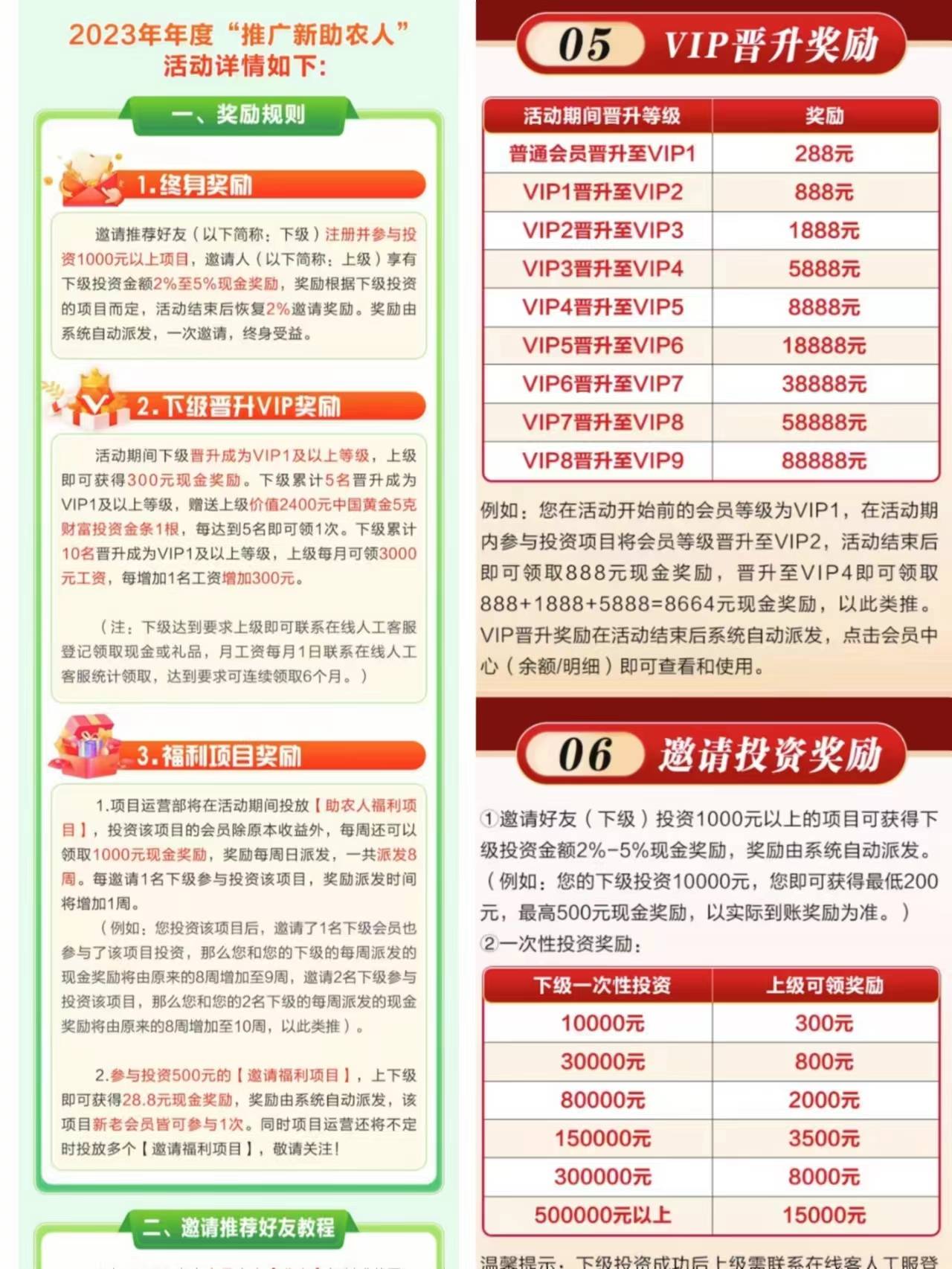 与此同时,平台还推出了“推广新助农人”活动,活动规定:邀请好友(下级)注册并投资1000元以上,上级享受下级投资金额2%-5%的现金奖励,下级晋升VIP上级即可获得300元现金奖励,每达到5人晋升可额外获的金条,累计10人晋升便可以每月领取3000元工资奖励。