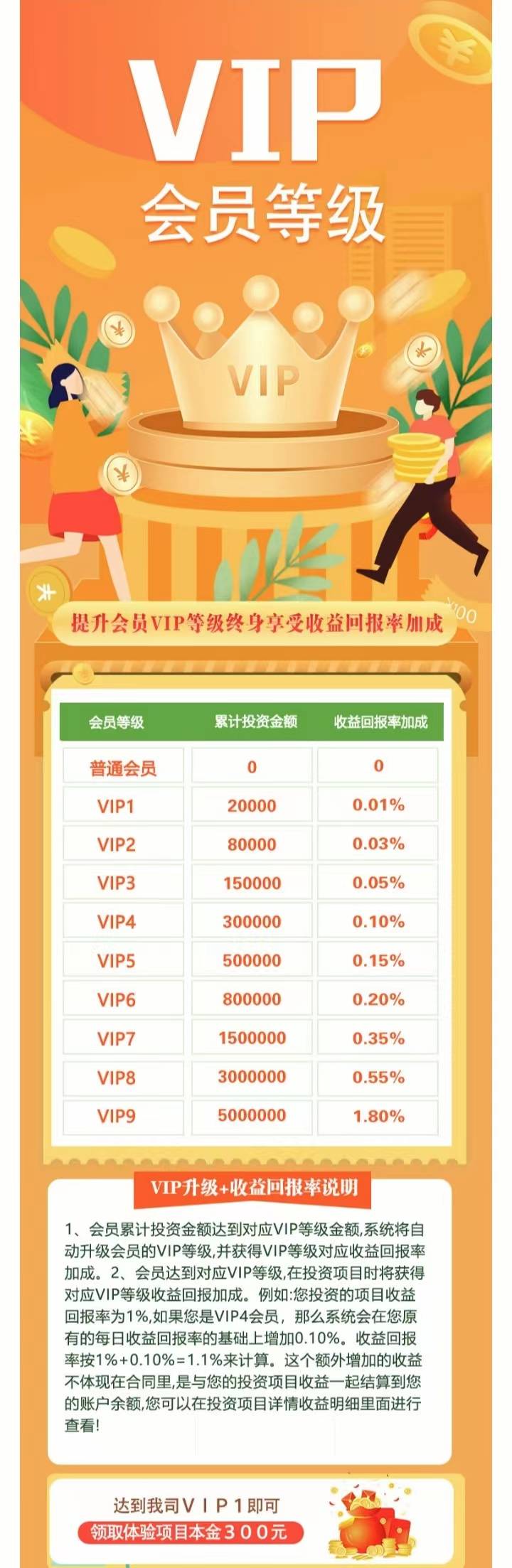 不仅如此,平台还设立了VIP等级制度,收益回报率按照等级还可以进行加成,投资金额越高,等级越高,收益回报率也就越高。