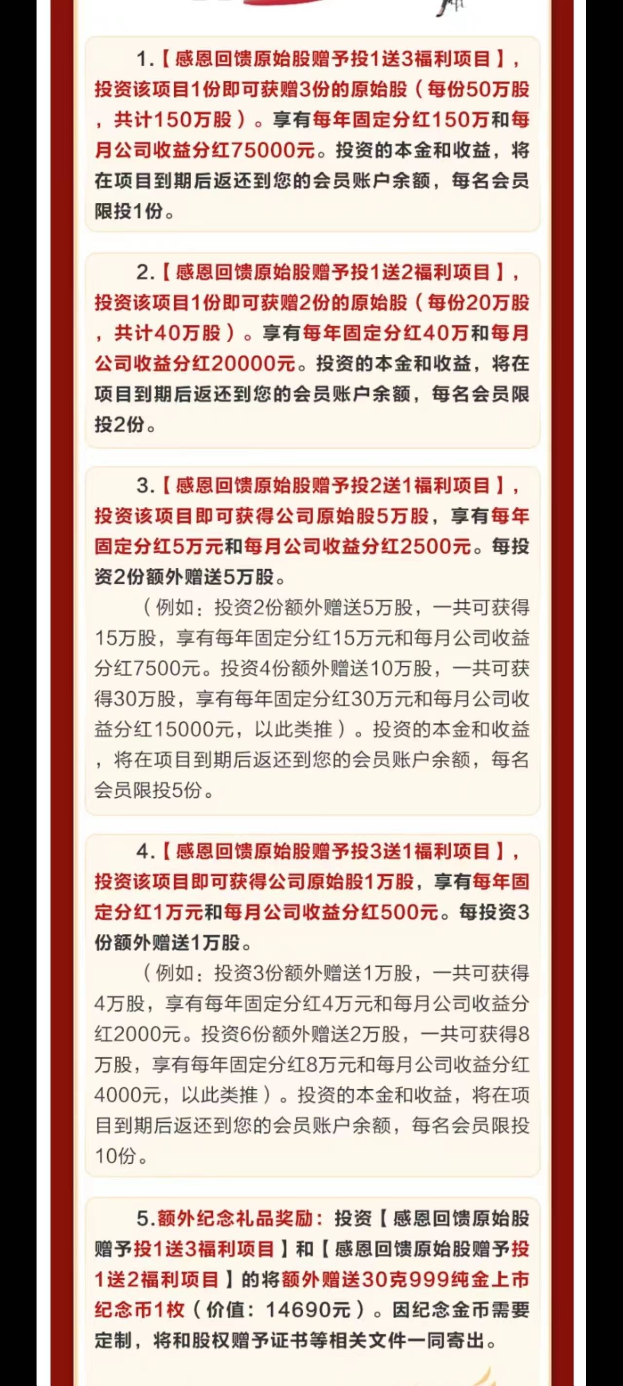 甚至投资某些特定项目,即可获赠公司原始股,每年享受固定分红和公司收益。