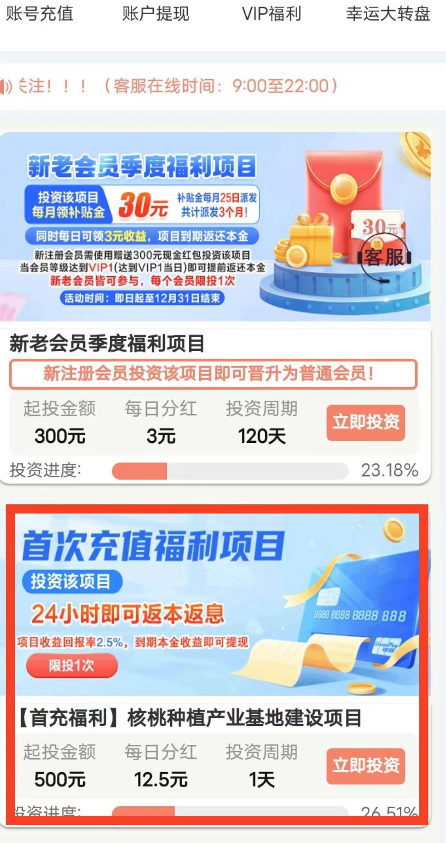 并且,“嘉澜在线”十分“聪明”的为新人设置了起投500元且投资周期只有一天的首次充值福利项目,新实名注册的会员就可以获得300元现金红包,该红包只能用于投资该首充项目,新人只需要花费200元,第二天就能获得12.5元的收益,收益率高达2.5%,这种类似“薅羊毛”的做法就是为了让新人尝到甜头,相信平台的高额收益确实能够到账,以便诱导投资人不断加大投资。
