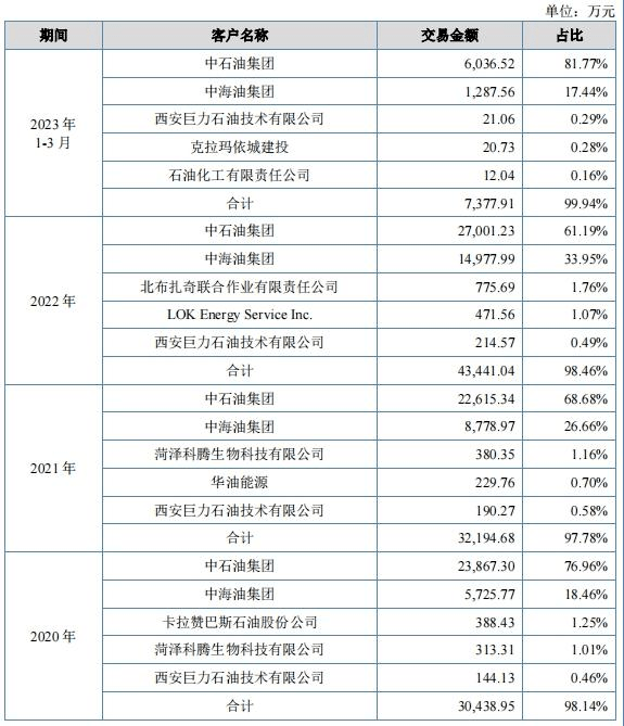 作为和石油打交道的企业,科力股份和国内的“三桶油”中石油、中海油、中石化关系密切。招股书显示,近三年,公司第一大客户均为中石油集团的下属单位,双方各期达成销售额分别2.39亿元、2.26亿元、2.7亿元及6036.52万元,占公司主营业务收入的比例分别达76.96%、68.68%、61.19% 和81.77%。