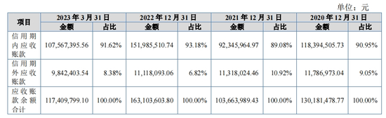 应收账款账龄来看,公司1年以内的应收账款占比各期分别为86.97%、86.31%、91.45%及89.22%。报告期各期,公司信用期内的应收账款占比分别为90.95%、89.08%、93.18%及91.62%,应收账款信用期内款项大于应收账款1年以内款项。
