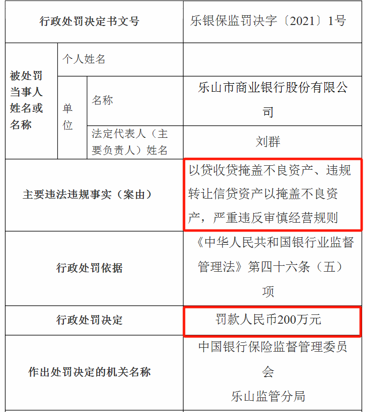 2021年6月,乐山商行由于以贷收贷掩盖不良资产、违规转让信贷资产以掩盖不良资产,严重违反审慎经营规则, 被罚款人民币200万元。同时,该行行长张霞对违规转让信贷资产以掩盖不良资产的违法违规行为承担直接责任被警告并罚款5万元;副行长汤捷对违规转让信贷资产以掩盖不良资产的违法违规行为承担直接责任被警告;副行长李岚对该行以贷收贷掩盖不良资产、违规转让信贷资产以掩盖不良资产的违法违规行为承担直接责任被警告并罚款7万元。