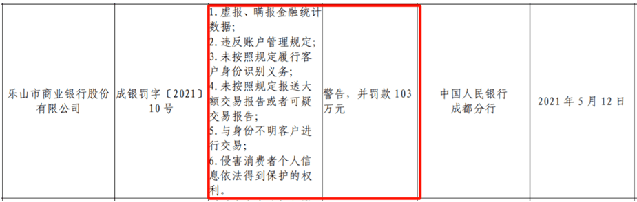 2021年5月,乐山商行因存在虚报、瞒报金融统计数据;违反账户管理规定;未按照规定履行客户身份识别义务;未按照规定报送大额交易报告或者可疑交易报告;与身份不明客户进行交易;侵害消费者个人信息依法得到保护的权利等违法违规行为被央行成都分行处以警告并罚款103万元。同时,该行5名相关责任员工受到处罚,其中副行长李岚因对该行与身份不明客户进行交易负有责任被罚款1.4万元,副行长刘凡因对该行未按照规定报送大额交易报告或者可疑交易报告负有责任被罚款1万元。