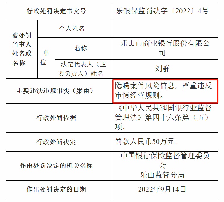 比如,2022年9月,原银保监会乐山监管分局发布的行政处罚信息显示,乐山商行由于隐瞒案件风险信息,严重违反审慎经营规则,被罚款人民币50万元。