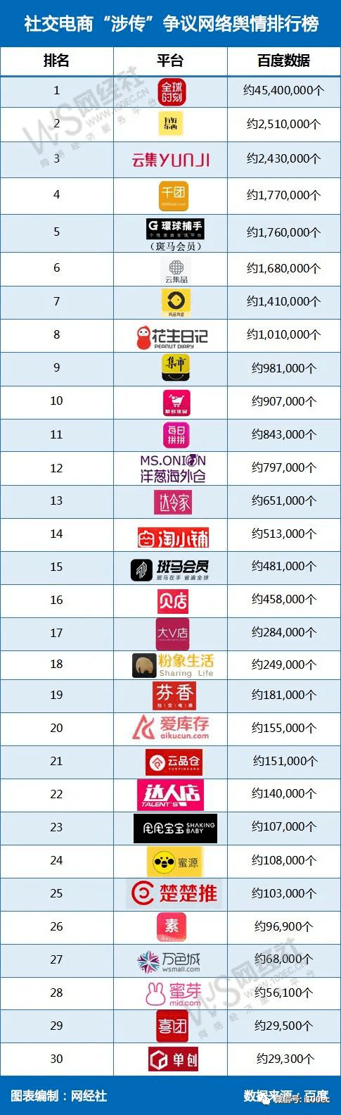 《报告》还发布“社交电商‘涉传’争议网络舆情排行榜”,榜单根据百度数据对社交电商“涉传”话题进行舆情监测显示: