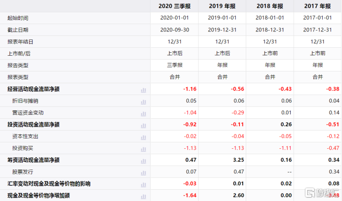 其另一个特征是,现金流依赖外部融资。在账面整体产生亏损的情况下,公司的经营活动现金持续流出,而且流出金额还远远大于净亏损额。2020年Q3亿航亏损4100万元,经营活动现金流出却是1.16亿元。