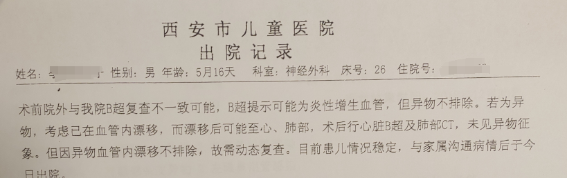 随后儿子被转往西安市儿童医院治疗,入院记录显示“左侧颞部可见静脉穿刺皮肤创口,距离皮肤创口约2.5cm处可见B超标记异物点。”然后在手术过程中该异物又消失了,医院记录称“考虑已在血管内漂移”。