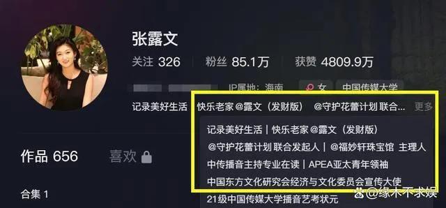 张露文为21级中国传媒大学播音艺考状元,是一位坐拥85万粉丝的大网红。她的个人简介里,满满当当都是自己的头衔,如“APEA亚太青年领袖""中国东方文化研究会经济与文化委员会宣传大使”等。