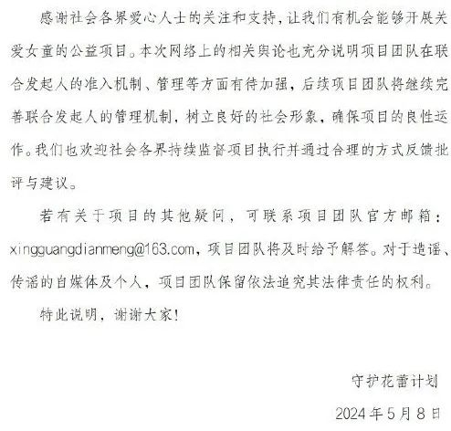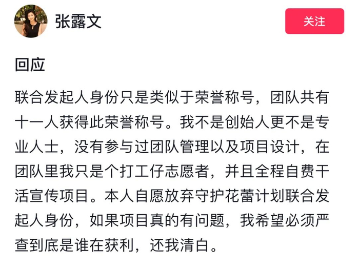 8日,张露文也在社交平台回应称:联合发起人身份只是类似于荣誉称号,团队共有十一人获得此荣誉称号。我不是创始人更不是专业人士,没有参与过团队管理以及项目设计,在团队里我只是个打工仔志愿者,并且全程自费干活宣传项目。本人自愿放弃守护花蕾计划联合发起人身份,如果项目真的有问题,我希望必须严查到底是谁在获利,还我清白。