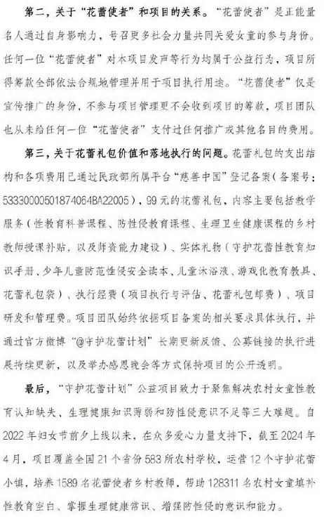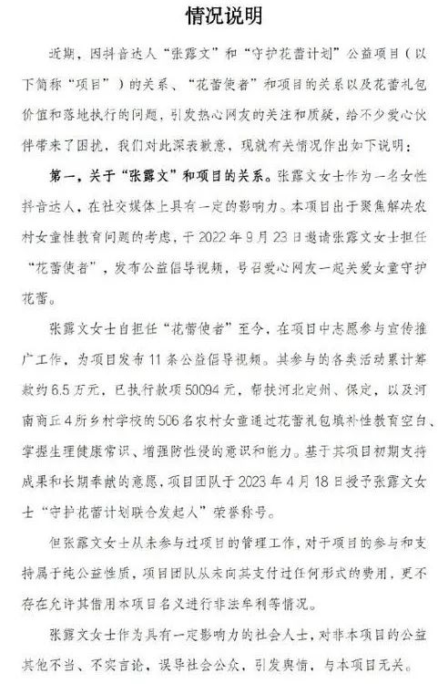 近期,因抖音达人“张露文”和“守护花蕾计划”公益项目(以下简称“项目”)的关系、“花蕾使者”和项目的关系以及花蕾礼包价值和落地执行的问题,引发热心网友的关注和质疑,给不少爱心伙伴带来了困扰,我们对此深表歉意,现就有关情况作出说明。
