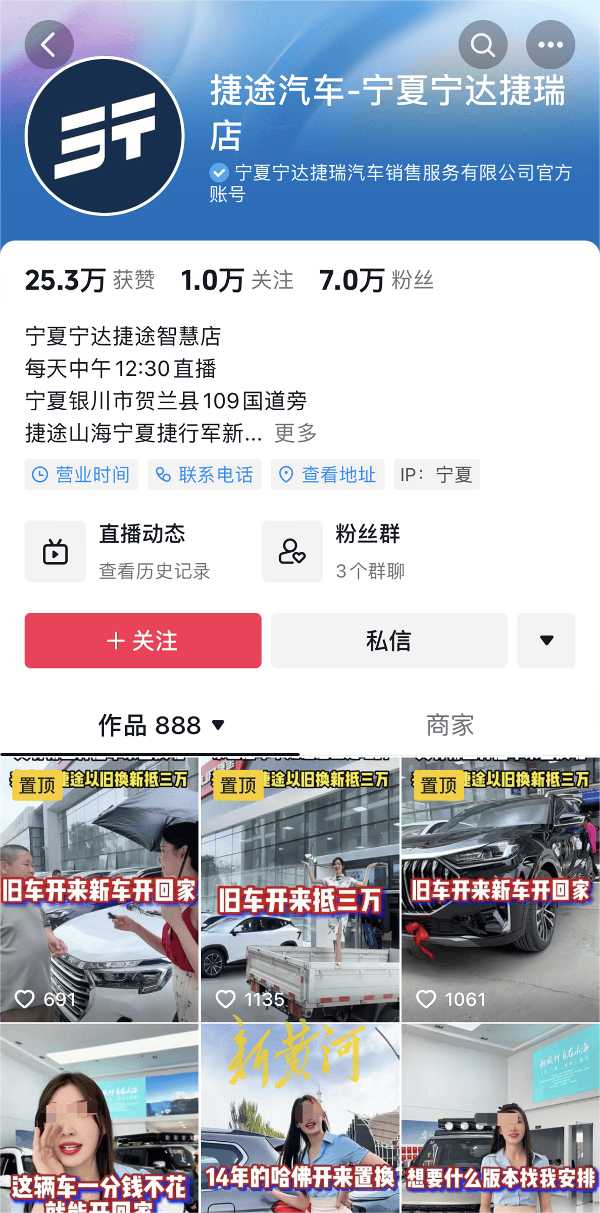 根据网友的指引,新黄河记者得知视频中的女主播叫“冰冰”,经常在抖音账号“捷途汽车-宁夏某店”出镜。网上流传的不雅视频,疑似出自该账号的直播。该抖音号有7万粉丝,账号认证信息显示为“宁夏宁达捷瑞汽车销售服务有限公司官方账号”。5月13日该账号还在正常更新内容。