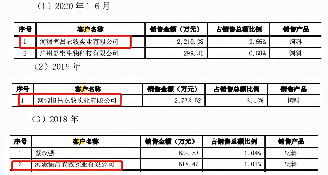 2018年-2020年上半年,东瑞股份向恒昌农牧的销售金额分别为618.47万元、2733.52万元、2210.38万元,占当期总销售金额的比例分别为1.01%、3.13%和3.66%,呈不断增长趋势。其中2019年和2020年上半年恒昌农牧均为东瑞股份第一大客户。