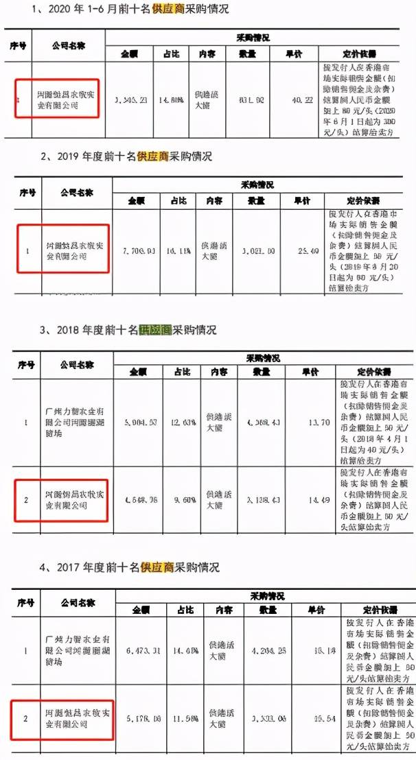 2017年-2020年上半年,东瑞股份向恒昌农牧的采购金额分别为5178.16万元、4548.76万元、7700.93万元和3345.21万元,占当期总采购金额的比例分别为11.56%、9.60%、16.11%和14.88%。恒昌农牧2017年和2018年为东瑞股份第二大供应商,2019年和2020年上半年为东瑞股份第一大供应商。