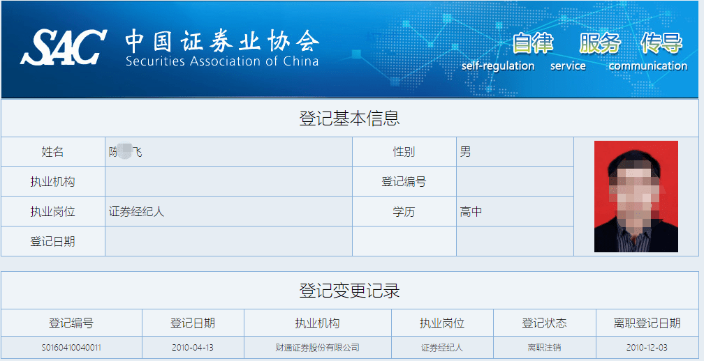 中国证券业协会网站显示,陈某飞为高中学历,于2010年4月13日在财通证券任证券经纪人,于2010年12月3日离职注销。