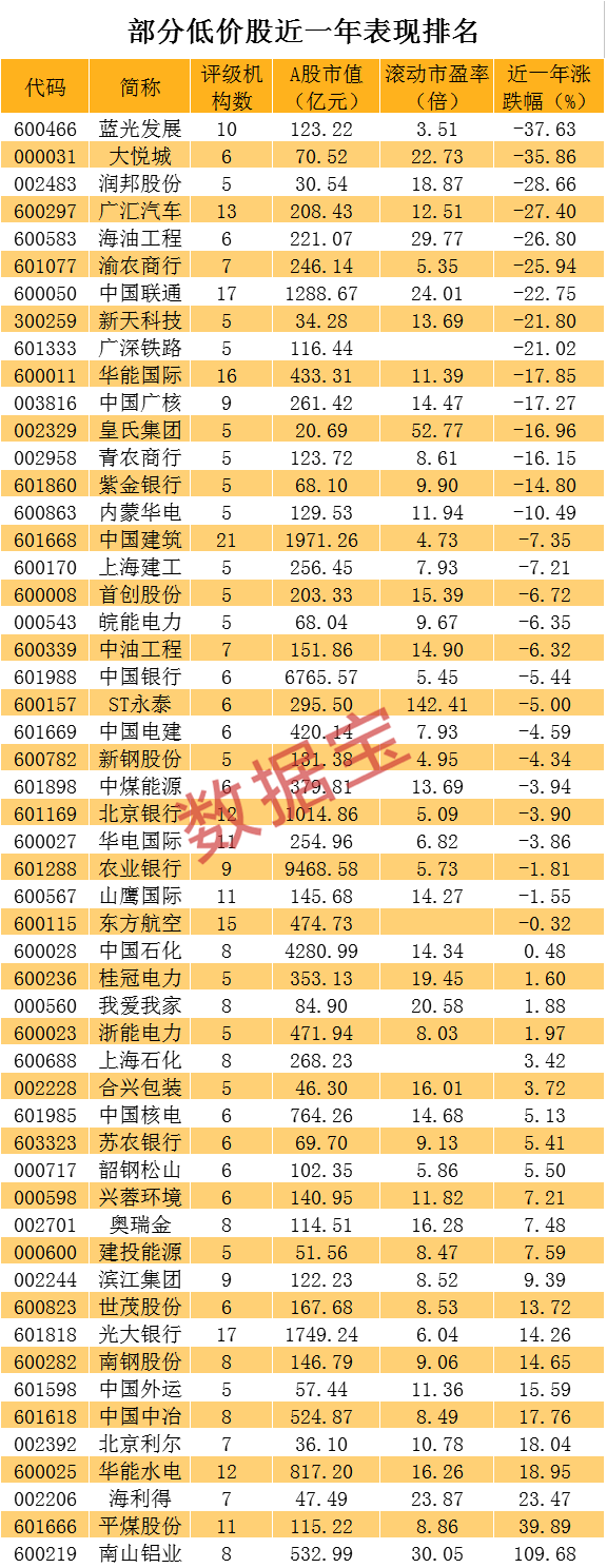 证券时报·数据宝统计显示,最新股价在5元以下、评级机构数在5家以上的个股,合计共有53只个股。这里面的个股多为传统行业股票,契合当前市场情绪,其中包括了农业银行、中国银行、中国石化、光大银行、中国建筑等传统蓝筹白马,市值较小的个股主要有皇氏集团、润邦股份、合兴包装等。