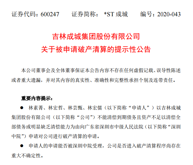 *ST成城全称为“吉林成城集团股份有限公司”,公司主要业务为房产租赁。目前,公司还有进入破产清算的风险。2020年8月26日晚,*ST成城公告,相关申请人以公司不能清偿到期债务且资产不足以清偿全部债务或明显缺乏清偿能力为由向深圳市中级人民法院申请对公司进行破产清算。申请人的申请能否被法院受理,公司是否进入破产清算程序尚存在重大不确定性。
