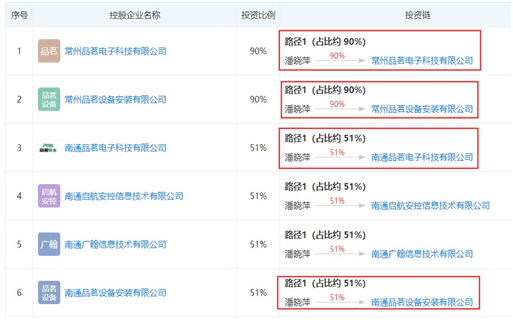 据公开信息,潘晓萍持有南通品茗51%的股份。此外,潘晓萍持股并担任重要职位的其他公司中,还有另外三家公司商号都使用了“品茗”这一商号,分别为南通品茗设备安装有限公司、常州品茗设备安装有限公司、常州品茗电子科技有限公司(下称:常州品茗),潘晓萍持有上述企业的股份分别为51%、90%、90%。