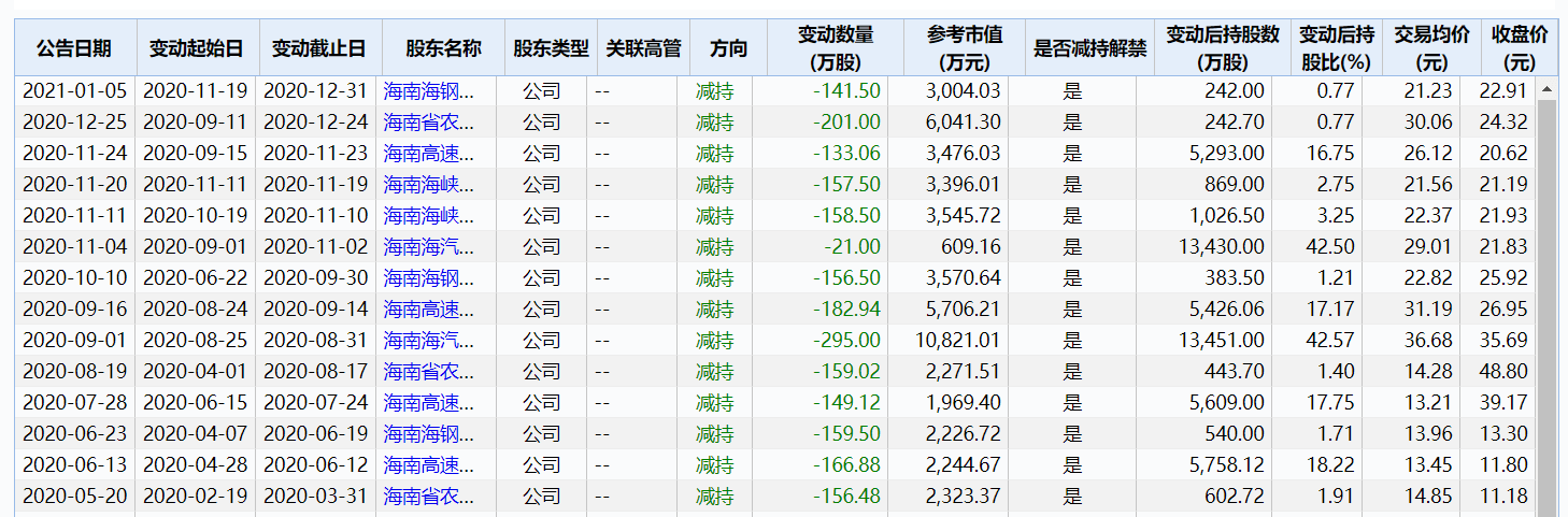 值得注意的是,2020年以来大规模减持的股东不止海峡股份,据不完全统计,海汽集团近一年共发布25次减持类公告。截止1月5日,持股前五大股东海南海钢集团有限公司、海南省农垦投资控股集团有限公司、海南高速公路股份有限公司、海南海汽投资控股有限公司近一年皆存在减持海汽集团股份的情况。