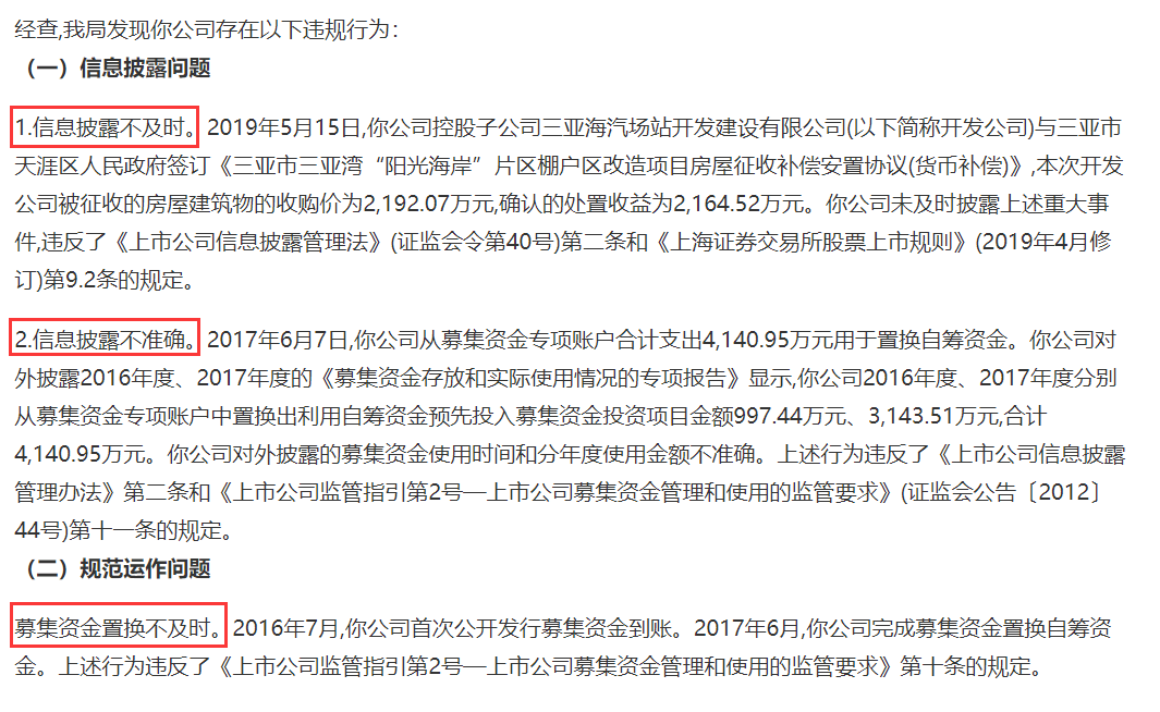 此公告中还公示了《关于对符人恩采取监管谈话措施的决定》(〔2021〕5号),海汽集团控股子公司三亚海汽场站开发建设有限公司与三亚天涯区人民政府于2019年5月15日签订《三亚市三亚湾“阳光海岸”片区棚户区改造项目房屋征收补偿安置协议(货币补偿)》,本次开发公司被征收的房屋建筑物的收购价为2192.07万元,确认的处置收益为2164.52万元。海汽集团未及时披露上述重大事件。