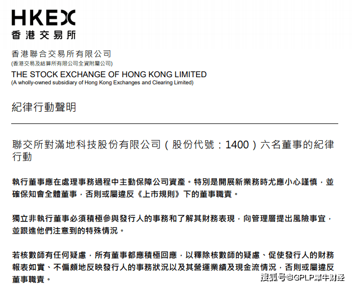 2月17日,满地科技股份(01400.HK)发布公告称,针对该公司工程塑料贸易业务,港交所裁定满地科技股份内部监控系统存在重大缺失问题,对其6名董事加以批评谴责,并要求该公司进行内部监控检讨及董事培训。