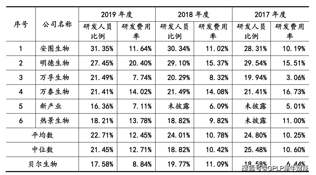 招股书显示,2017年至2019年,贝尔生物的研发费用分别为987.99万元、1936.88万元、1945.64万元,占营业收入比例分别为6.44%、11.09%、8.84%,略低于行业平均水平。
