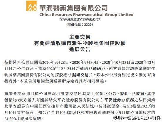 2月10日,华润医药(03320.HK)发布公告称,因卖方高特佳集团未按约定向平安证券股份有限公司(下称“平安证券”)支付财产份额转让款,高特佳集团所持目标公司博雅生物的1.04亿股被司法冻结。除博雅生物于股东大会上批准发行股份以及国家市场监督管理总局反垄断局通过经营者集中审查外,所有其他先决收购条件尚未达成。