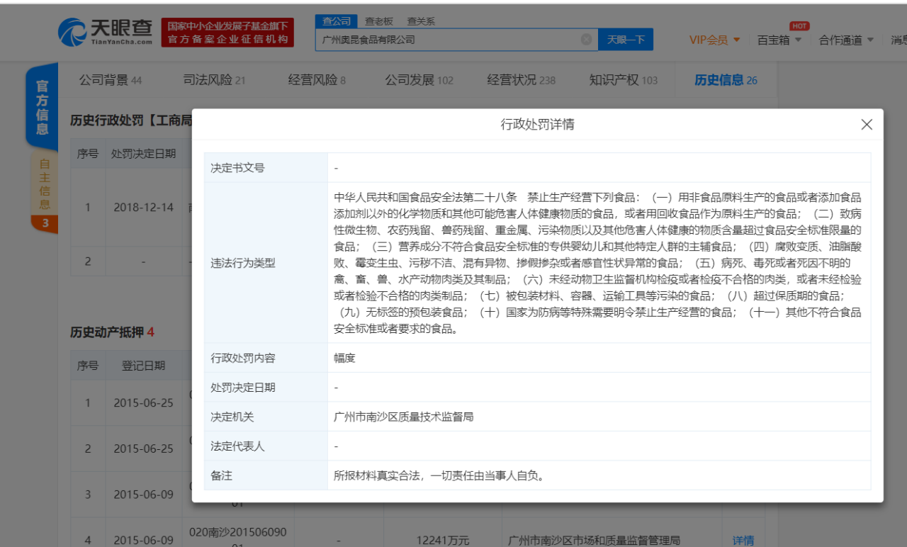 天眼查显示,2018年12月14日,广州奥昆食品有限公司因改扩建项目未依法报批环境影响评价文件而擅自开工建设,被南沙区环保水务局罚款0.82万元,并要求其停止改建、扩建项目的建设。